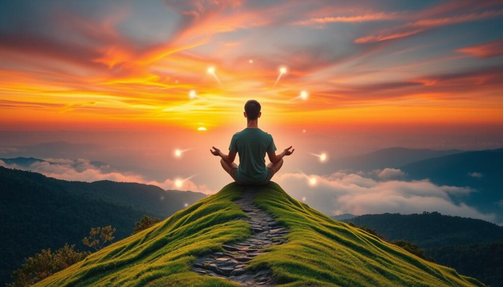Positive thinking is vital. It means staying optimistic, using affirmations, and turning negative thoughts into positive ones. This boosts your energy and attracts opportunities.