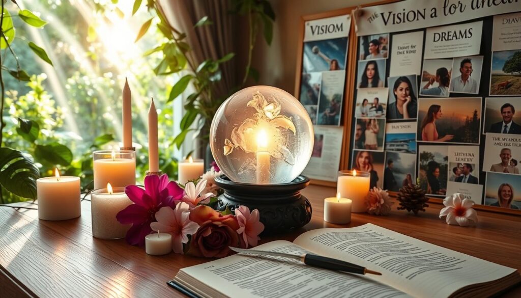Vision boards are great for making your dreams real. They help you stay focused on what you want. Sites like Pinterest and Canva make it easy to create beautiful vision boards.